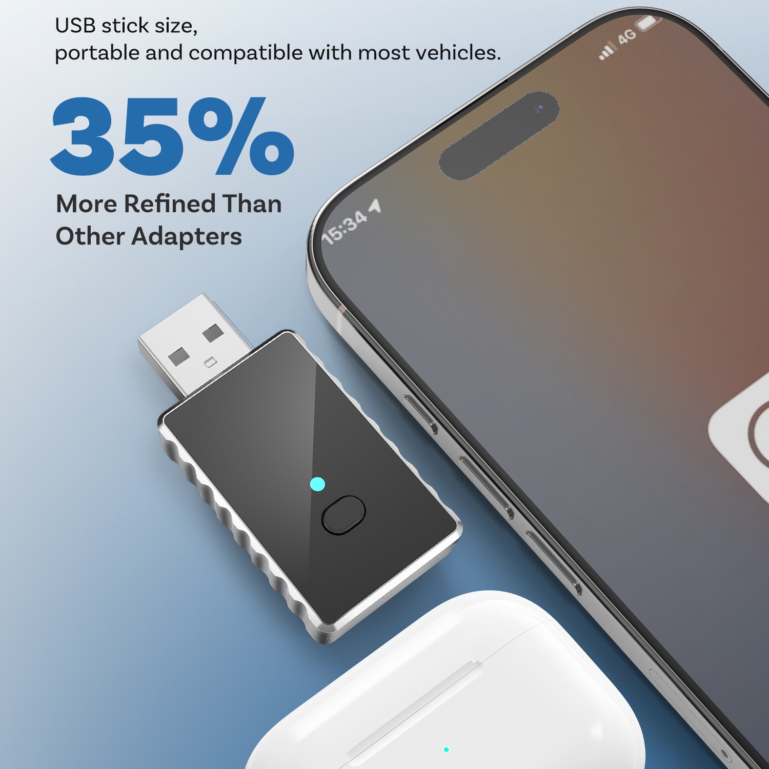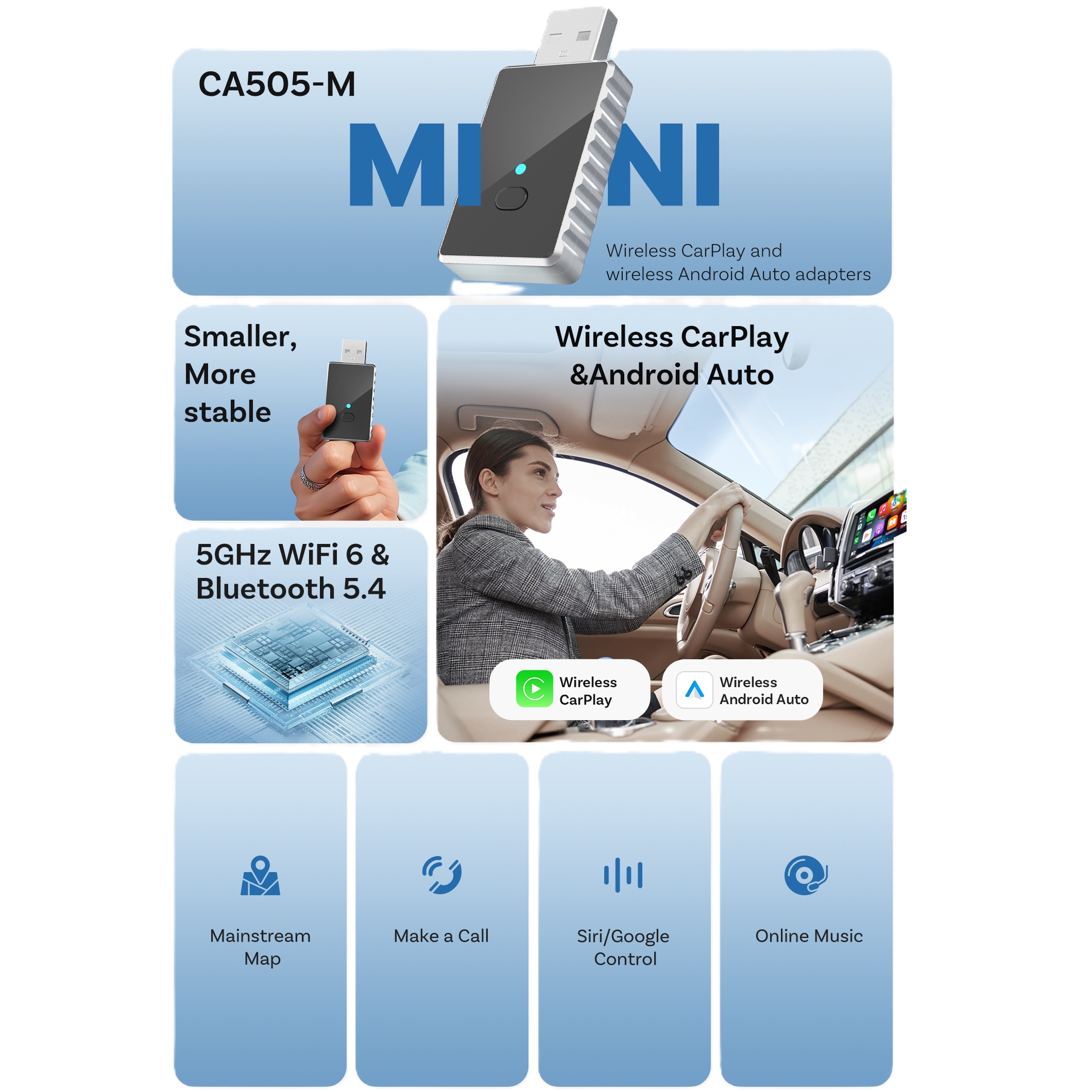 Naudojant miniatiūrinį CA505 modulį, nebereikia prijungti telefono prie automobilio USB prievado. Ryšys su automobilio „Apple CarPlay“/„Android“ automobiliu bus automatiškai per „WiFi“, kiekvieną kartą įjungus degimą. Modulis lieka visam laikui prijungtas prie automobilio USB prievado ir jūs galite mėgautis laisve be kabelio.